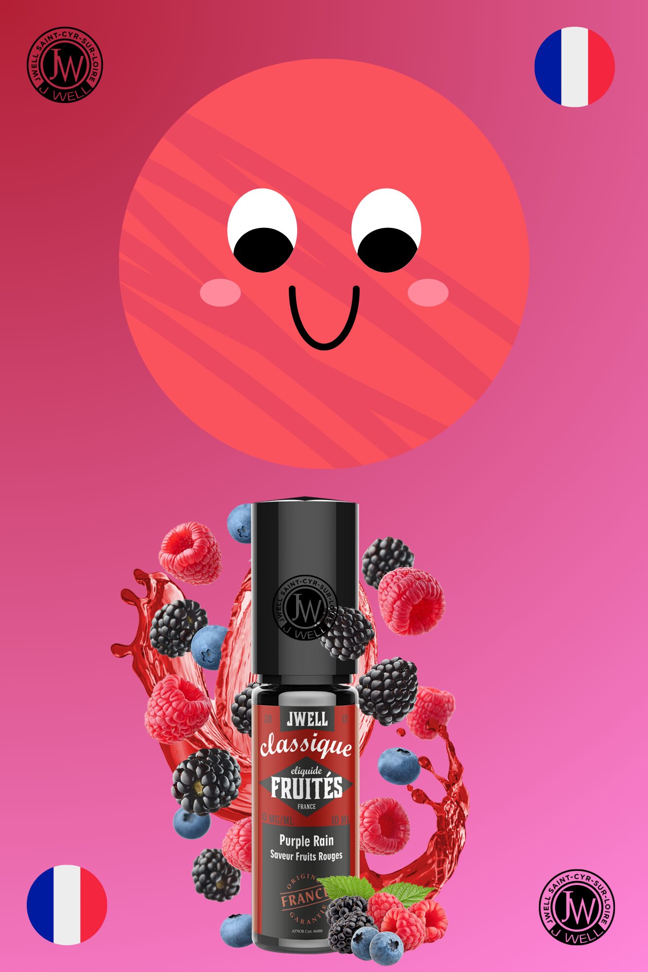 Caractéristiques du e-liquide Purple Rain : Le e-liquide Purple Rain s’inspire d’une saveur de fruits rouges, offrant un goût simple et fruité.